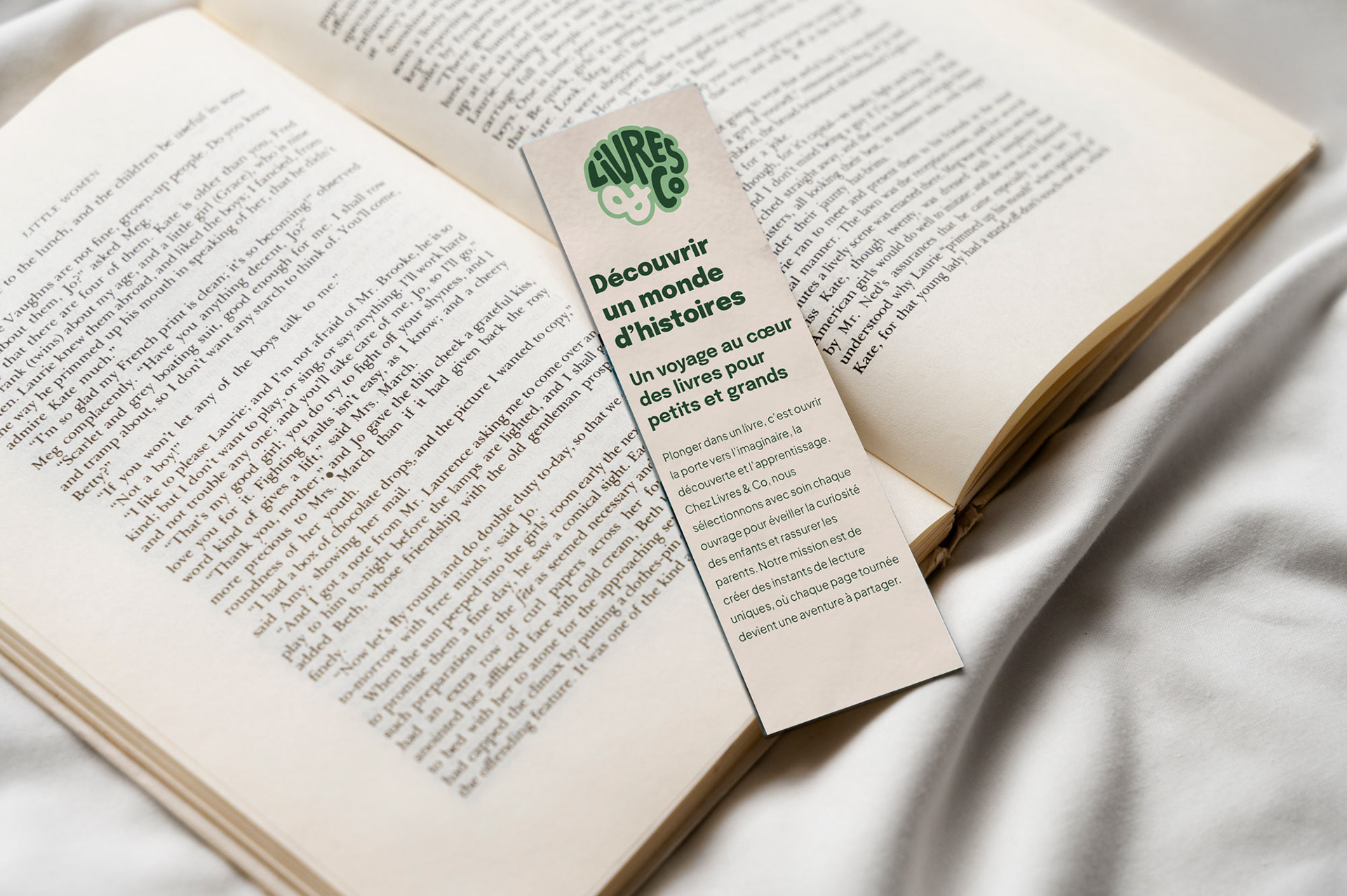 Le logo a été conçu comme un tampon : un format simple et facilement déclinable, adapté à des supports variés (papier, packaging, communication digitale). Sa forme arrondie évoque aussi un cerveau, symbole de la lecture, de la connaissance et de l’imaginaire. Cette double lecture, pratique et symbolique incarne parfaitement l’esprit de Livres & Co : un accès direct et accessible à la culture.